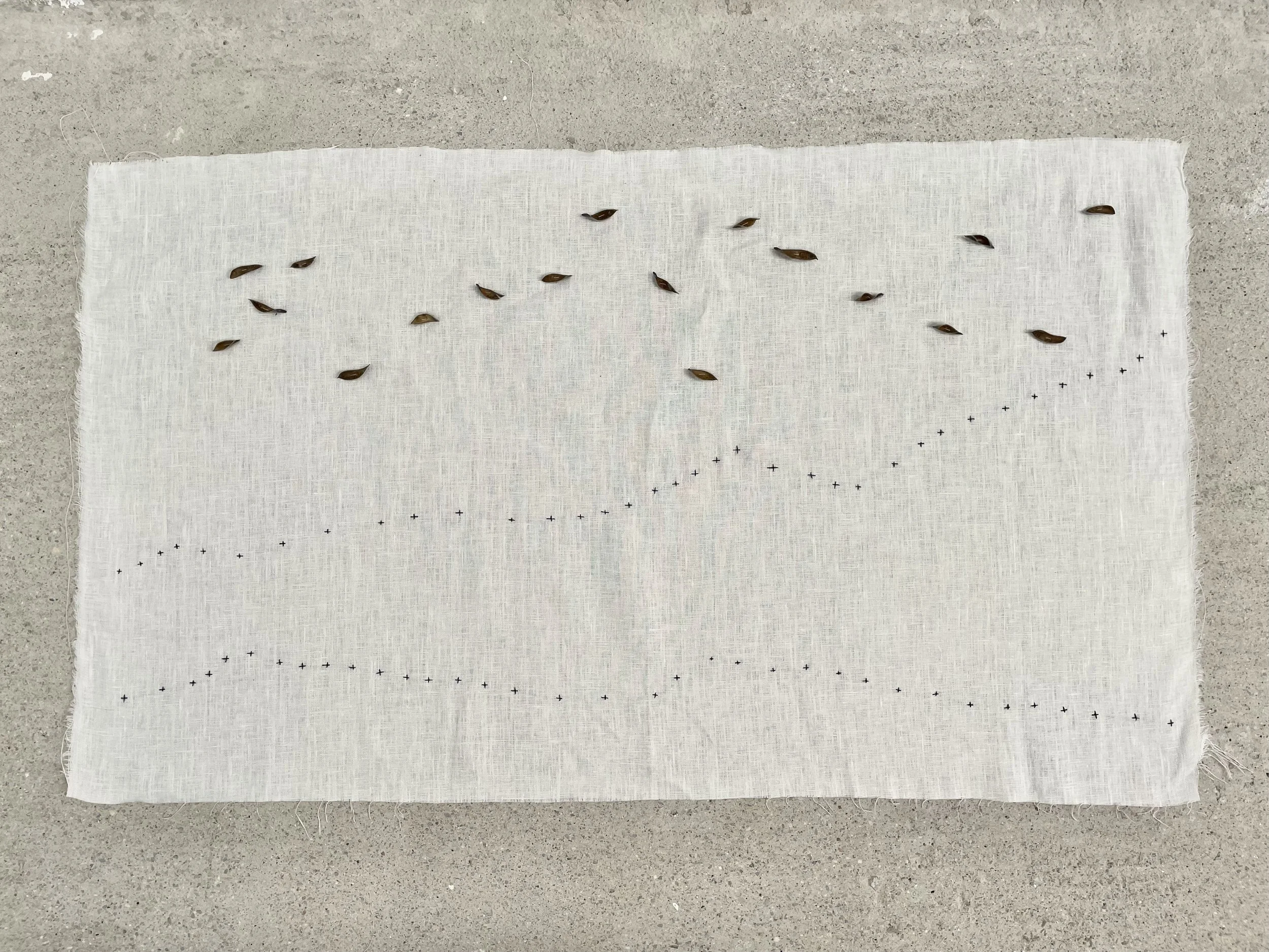 Fotografía 3: Xesta – un campo de estrellas. / Bordado. Materiales: vainas de semillas de retama, hilo, tela.